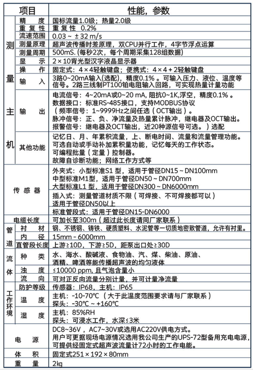 固定式超声波流量计/热量表主机,分为壁挂标准型、隔爆防爆型、电池供电型,高清液晶显示,中英意三种语言,可显示瞬时流量、净累积量、瞬时流速、正累积量、负累积量、日期时间、热流量/总热量、温度输入三线制PT100、今日累积流量,储存或读取管道参数等功能。分体固定式便于安装,适用于多种现场,产品设计寿命10年,记录数据存储时间长达10年,支持断电记忆。外夹式传感器是将传感器直接捆绑在被测管道的外表面从而实现流量测量的一种安装方式,因其安装不需要切断流体,不影响管道内流体的正常流通,无需与流体直接接触,避免了机械磨损和流体污染的问题。具有与管径无关、安装简单、无需破坏管道、无压力损失等特点。根据现场管道口径分大、中、小三种型号,外夹传感器材质为阻燃abs。